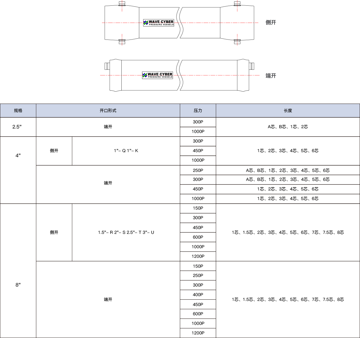 膜元件压力容器主要有端开和侧开两个型号,分为2.5英寸、4英寸和8英寸3个规格,适用压力涵盖150、300、450、600、1000、1200、1500psi 。